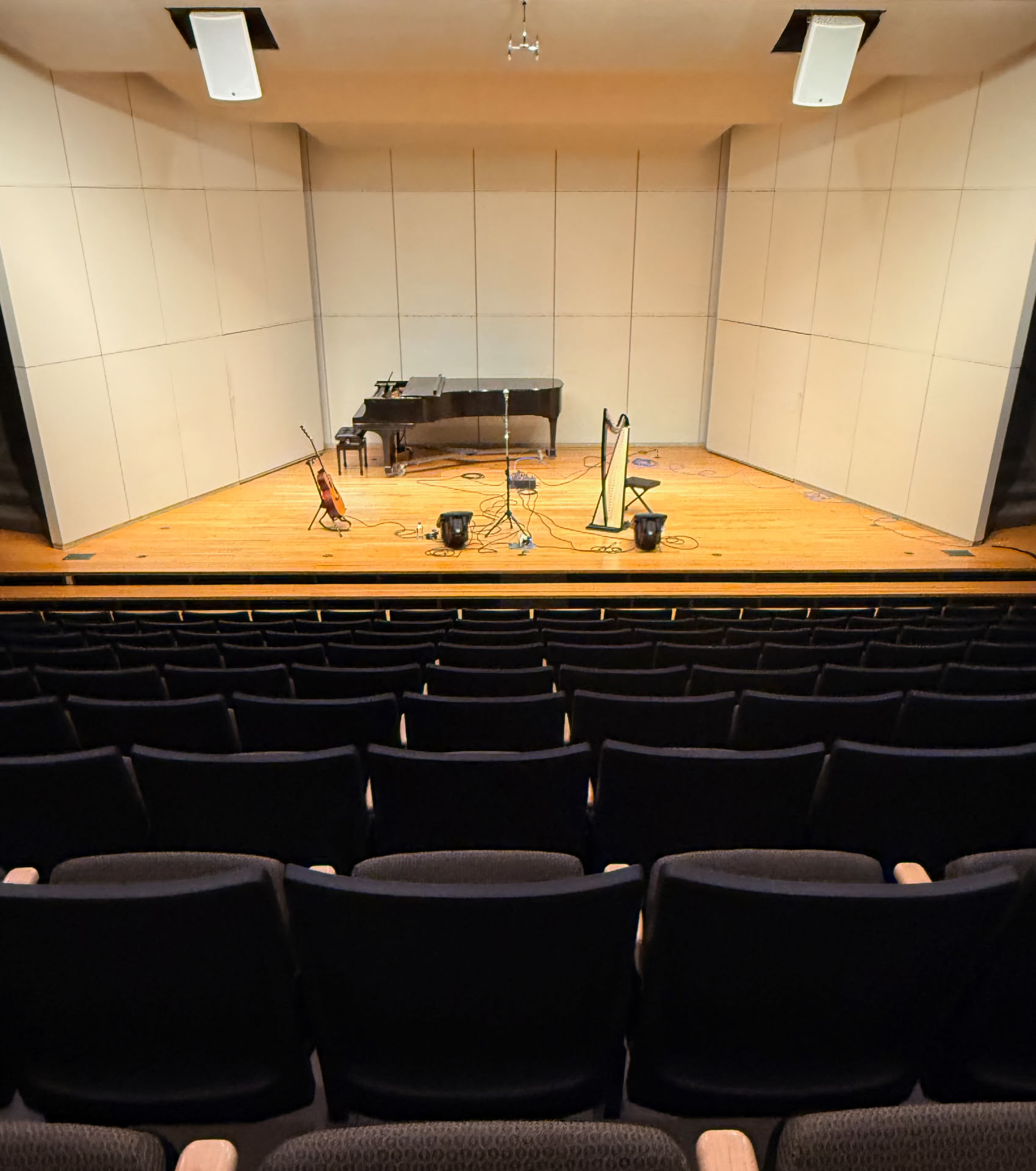 Cullen Recital Hall at the University of St Thomas in Houston, with Máire’s beautiful brand-new Camac Ulysse harp visible on stage. She’s looking forward to playing it for the first time in public at our concert there tonight!