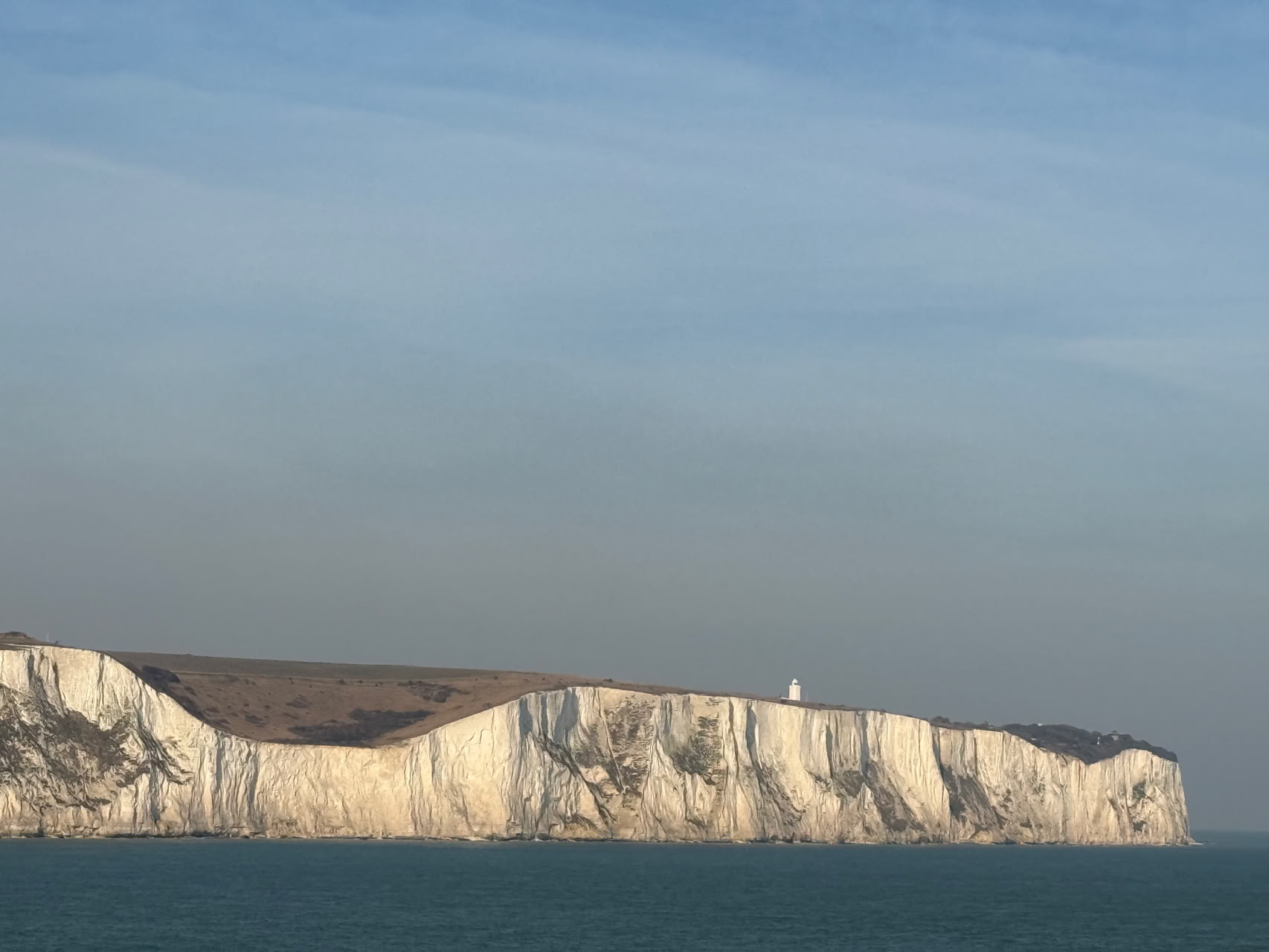 A photo of the White Cliffs of Dover (and they really do gleam white in the sunshine!) taken from the deck of the Calais-Dover ferry this afternoon, on our way to play at Dartford Folk Club (Kent) this evening…